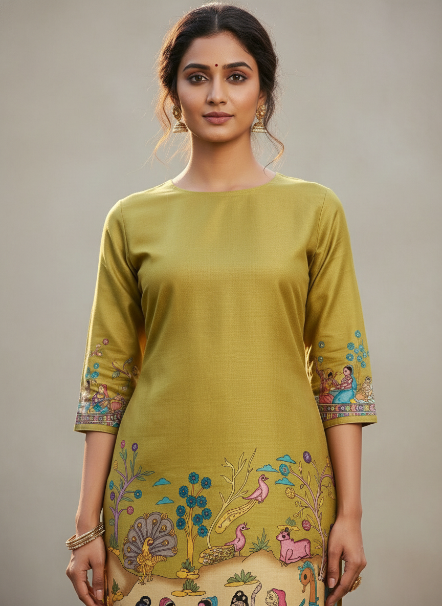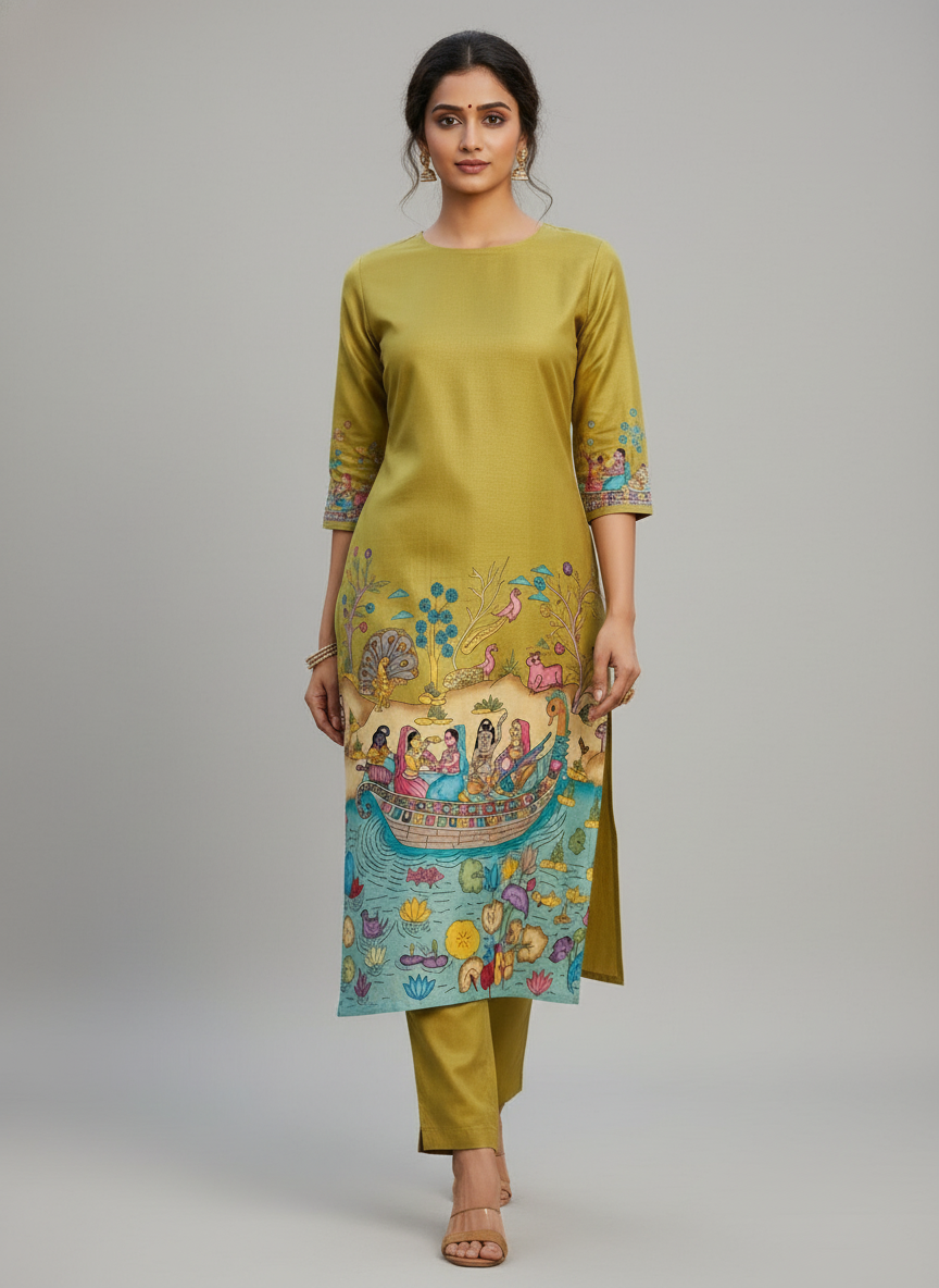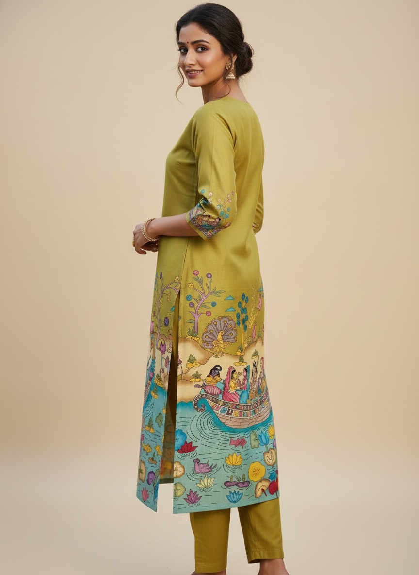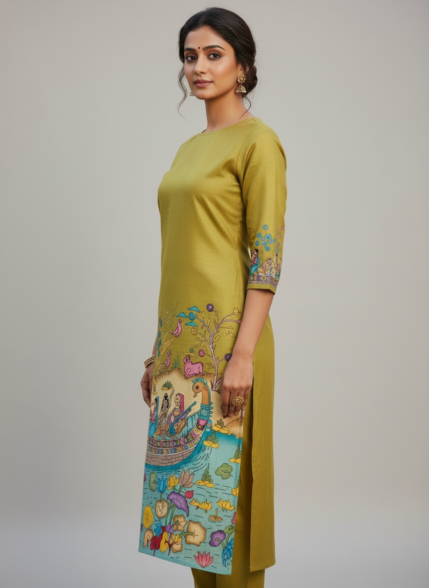 Elevate your ethnic wardrobe with this elegant olive green straight kurta set, inspired by traditional Indian miniature art. The kurta features a clean, minimal upper body that beautifully balances the richly detailed hand-painted style artwork showcased on the lower panel. The artistic scene depicts a serene river setting with floral motifs, birds, and human figures, creating a storytelling effect that feels both cultural and contemporary.
