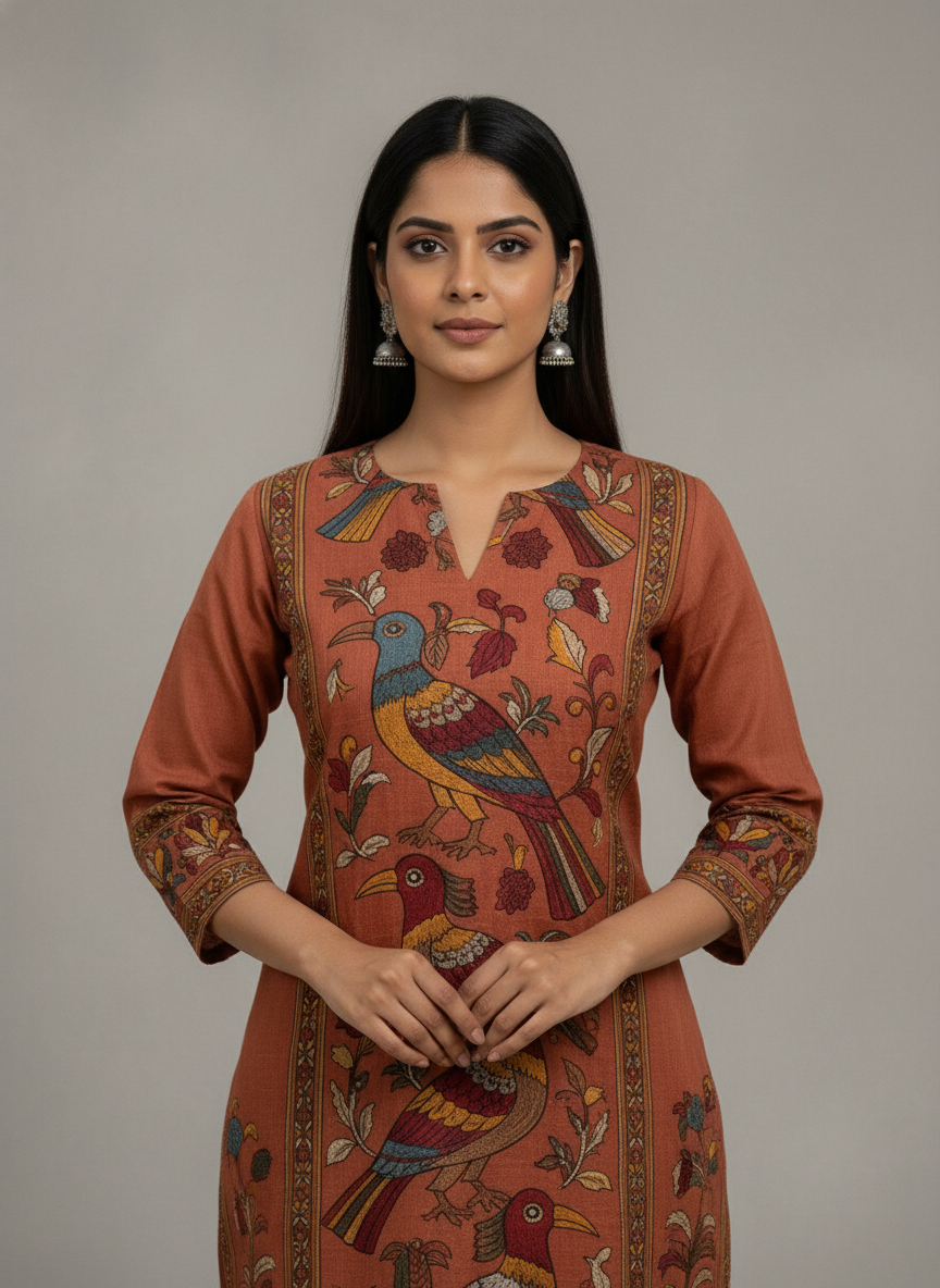 Warm rust base with traditional Kalamkari-inspired bird motifs
