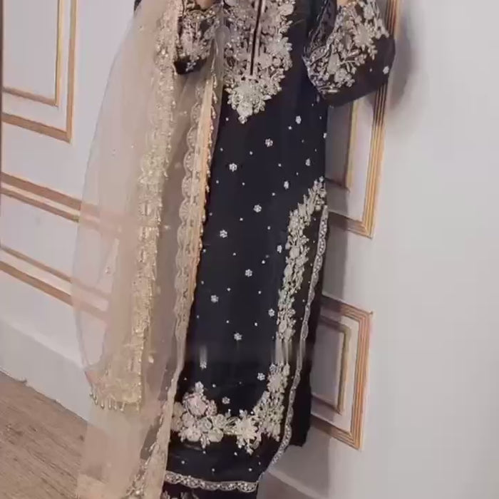 Drape yourself in timeless elegance with this midnight black three-piece embroidered suit set, meticulously adorned with intricate floral threadwork, sequins, and bead embellishments. The rich black hue, combined with pastel-toned embroidery and a sheer champagne net dupatta, makes this outfit a perfect blend of sophistication and luxury.
