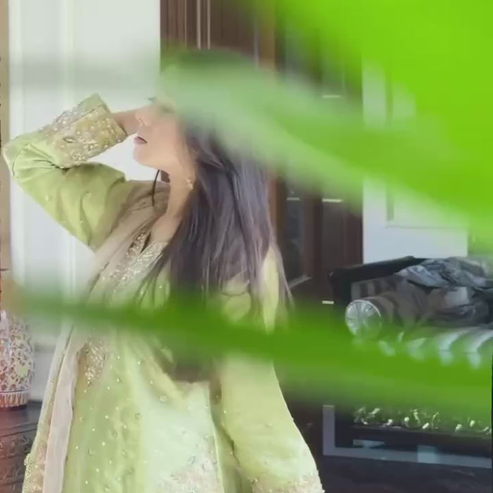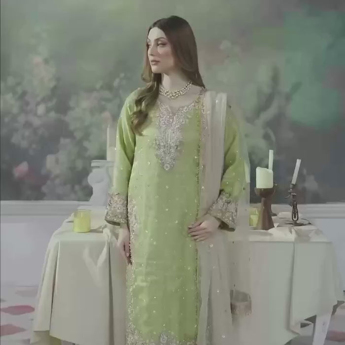 Exude grace and poise in this ethereal lime green straight-fit suit set, a perfect blend of traditional embroidery and modern sophistication. Crafted with luxe fabrics and intricate hand embellishments, this ensemble is ideal for formal festive events and elegant soirées.