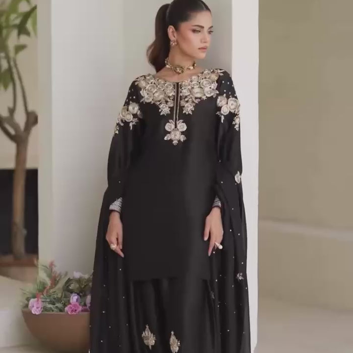 Exude regal charm with this Black Embroidered Farshi Shalwar Suit, a luxurious ensemble crafted for festive and formal occasions. The black satin-finish kurta features intricate gold and silver thread embroidery on the neckline, shoulders, and front, creating a statement look. Paired with a voluminous farshi shalwar adorned with matching embroidered motifs and detailed striped borders, this outfit radiates elegance. The embellished chiffon dupatta completes the look with refined grace.