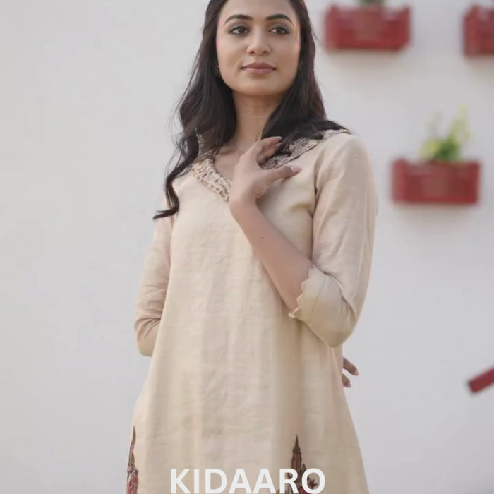 Elevate your everyday ethnic look with this elegant beige kurta set from KIDAARO Couture. Made from breathable cotton silk, this straight-fit kurta features a unique V-neckline with delicate thread and mirror work detailing. The standout feature is the exquisite hand-painted Kalamkari bird and floral motifs on the front, giving it a rich traditional appeal. Paired with maroon tapered pants, this ensemble is perfect for understated festive wear or smart casual outings.