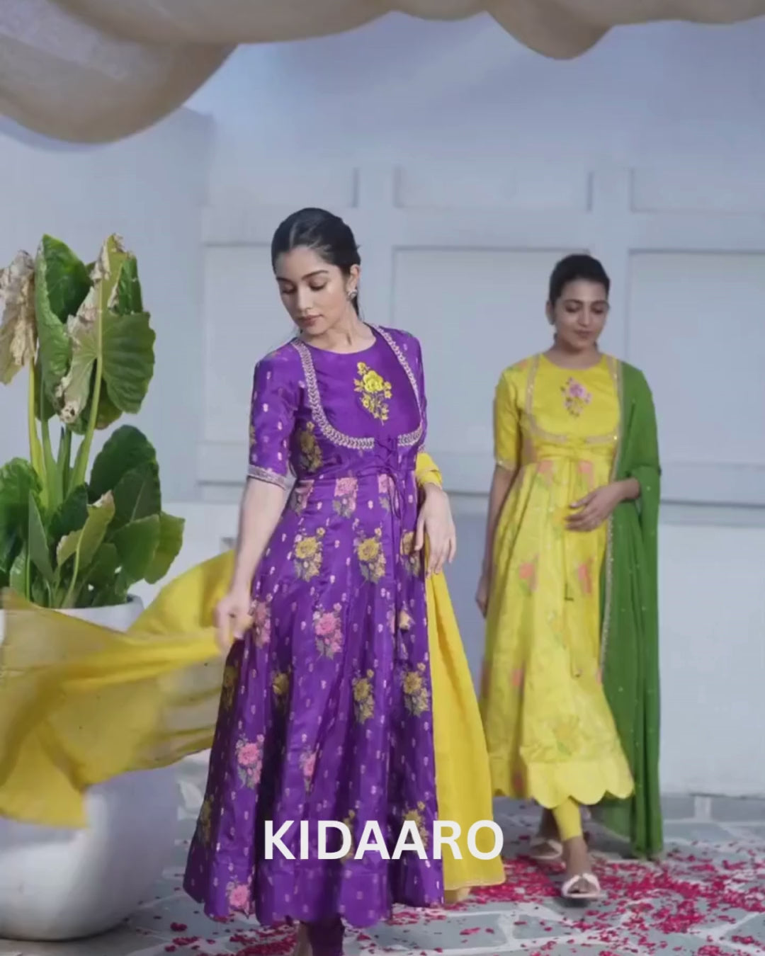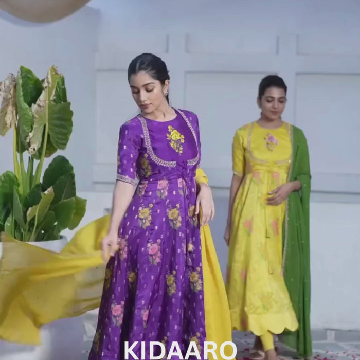 Make a bold and beautiful statement with this regal purple floral Anarkali set from KIDAARO Couture. The Anarkali features intricate floral prints combined with delicate embroidery on the yoke and sleeves, bringing a rich, festive charm. Its structured bodice and flowy silhouette flatter every body type. The set is paired with a vibrant mustard yellow dupatta adorned with dainty embellishments and scalloped borders, perfectly contrasting the deep hues of the dress. This ensemble is designed for women who love vibrant tradition with a modern twist.